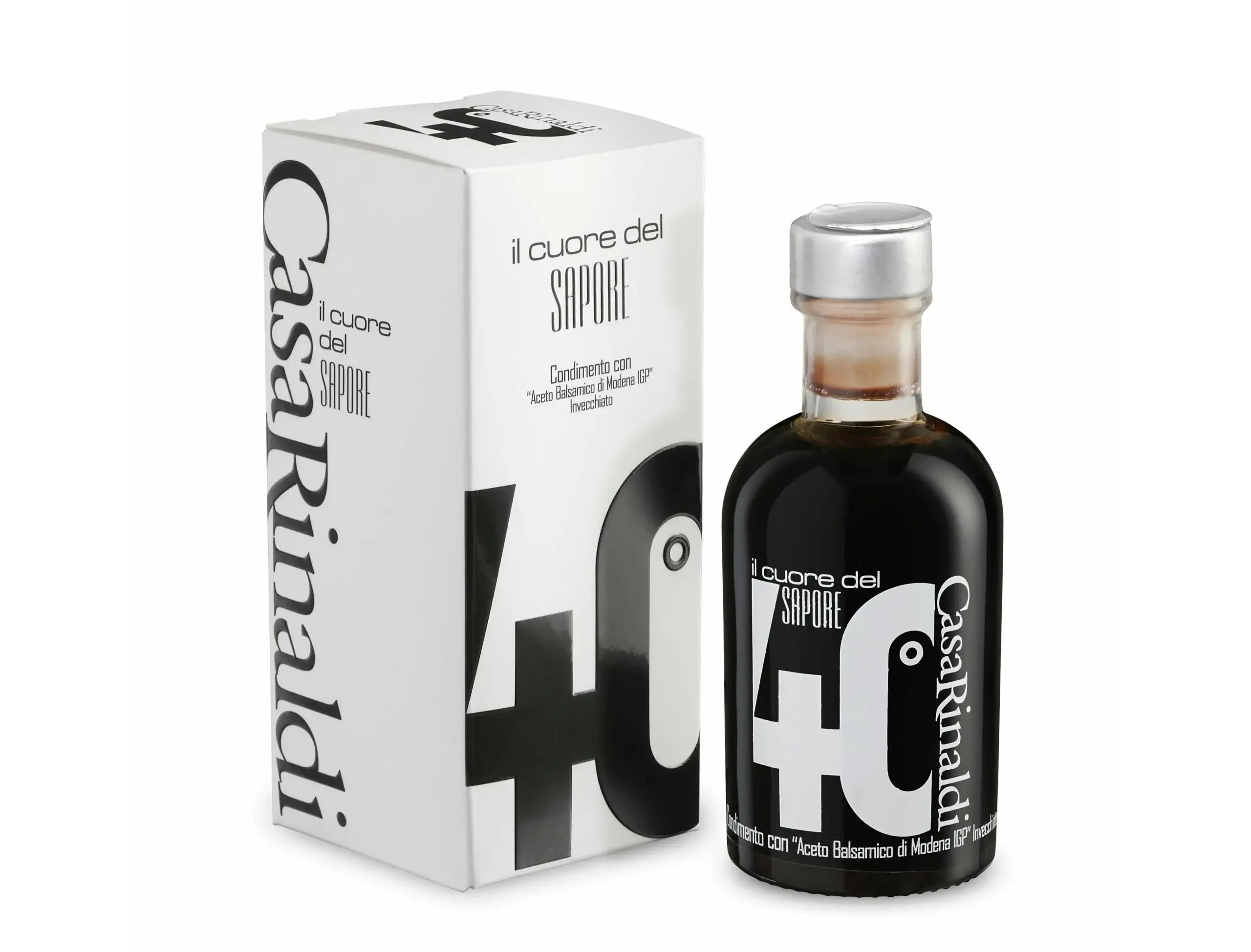 To celebrate its first 40 years, Casa Rinaldi creates a new condiment: the balsamic vinegar of Modena PGI “Il cuore del sapore”. It is a very fine PGI balsamic vinegar of Modena, consisting of aged balsamic vinegar with the addition of extra old vinegar. Shiny black in colour and with a density of 1.35, it is stored inside a particular and sophisticated bottle and sealed with a practical cork stopper. The scent of this vinegar is enriched by a pleasant and light hint of wood. The same wooden note is also appreciated when tasted.
